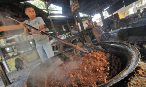 Mengaduk Rutin: rendang harus diaduk terus-menerus agar santan tidak pecah.